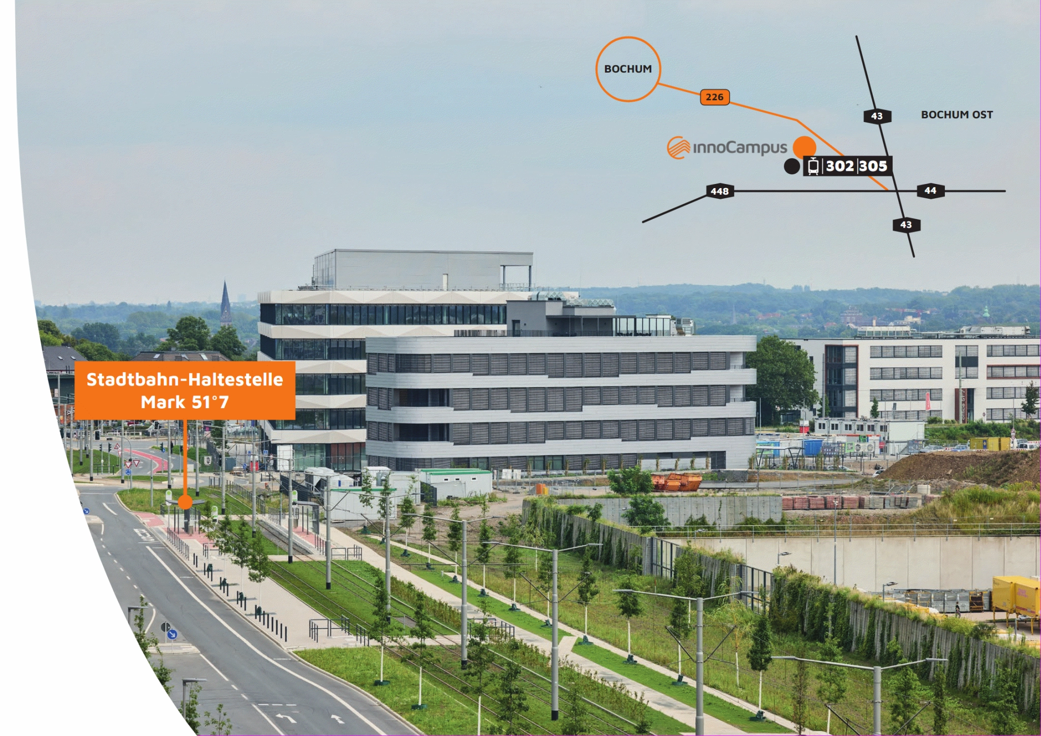 Das innoCampus-Gebäude verfügt über eine sehr gute Anbindung an den Nahverkehr. Die Straßenbahn sowie Busse halten in unmittelbarer Nähe und sind in ca. 3 Minuten fußläufig zu erreichen. Auch das Radwegenetz liegt direkt vor der Tür. Die Fläche bietet eine direkte Anbindung zu den Autobahnen A 448, A 44, A 43 und ist somit auch gut aus den umliegenden Städten sowie von außerhalb der Metropole Ruhr erreichbar.